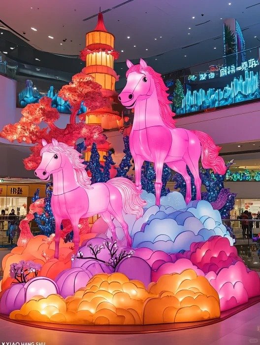 主題定位:貼合 2026 生肖馬屬性,以萌系粉色馬為主要形象,搭配裝飾塔、彩色祥云等元素,既呼應(yīng)馬年節(jié)日主題,又適配商場年輕時(shí)尚的空間氛圍,兼顧生肖寓意與打卡吸引力。